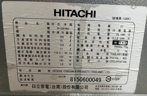 【型號】R-G41WS,2015年,泰國製,變頻一級節能省電