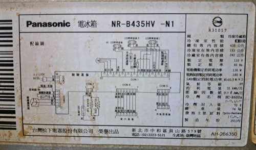 【型號】NR-B435HV-N1,2013年台灣製,變頻一級省電