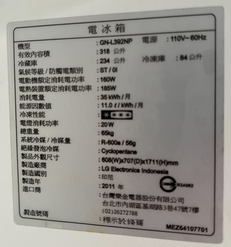 【型號】GN-L392NP,2011年,印尼製,變頻